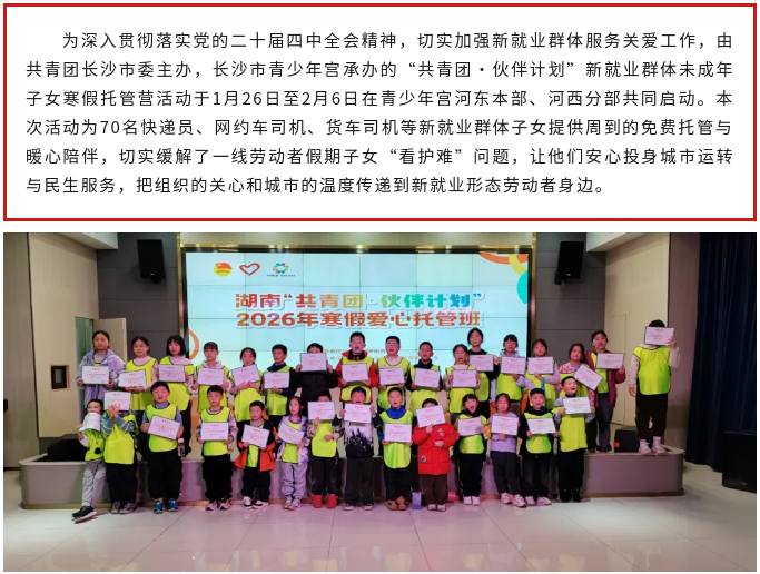 长沙市青少年宫积极响应“共青团•伙伴计划”,为新就业群体子女送上冬日温暖