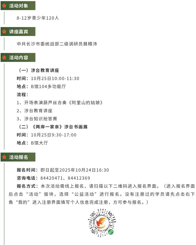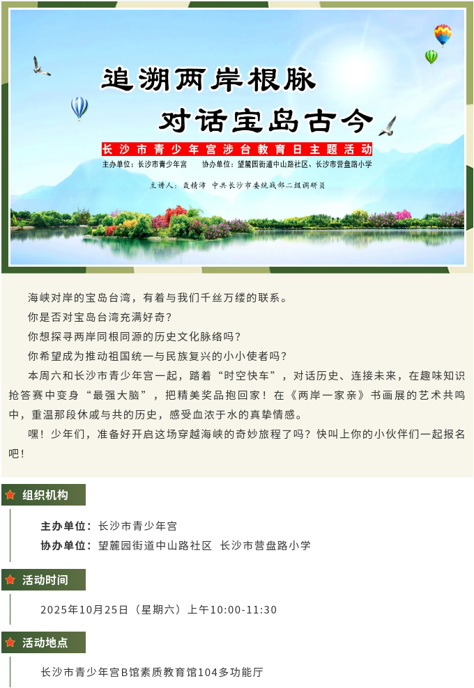 【河东本部活动招募】“追溯两岸根脉,对话宝岛古今”长沙市青少年宫涉台教育日主题活动邀你来参加!