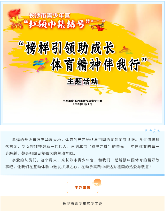 【活动招募】长沙市青少年宫第二十二期“红领巾集结号”之“榜样鼓舞助成长 体育精神伴我行”主题活动开始报名啦!